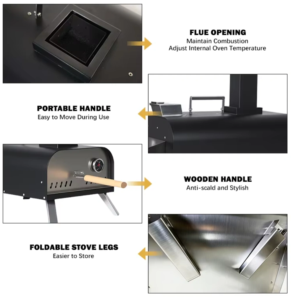 | Progettazione strutturale | Design portatile integrato + gambe pieghevoli + camino staccabile + sistema di controllo preciso della temperatura |